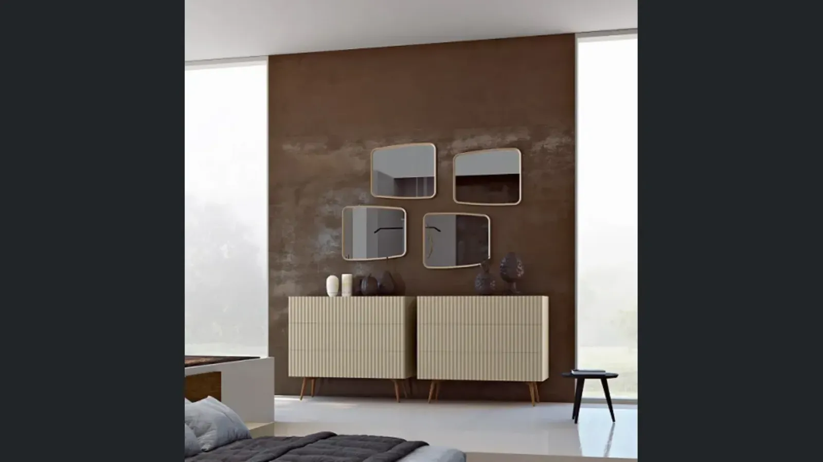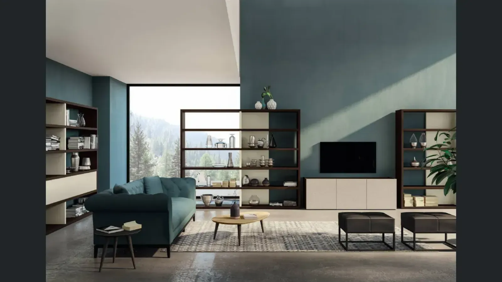 La parete principale è quella che ospiterà l’elemento dominante, sia esso una parete attrezzata, una libreria, un mobile TV o una composizione contenitiva.